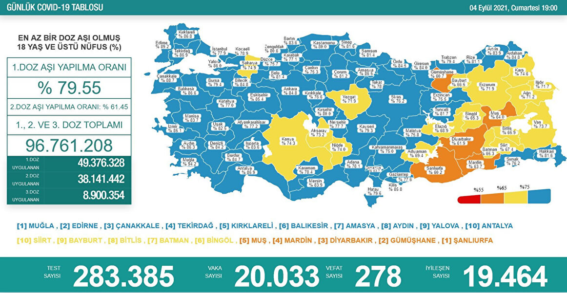 En az bir doz aşı yapılanların oranı en az iller ise Şanlıurfa, Gümüşhane, Diyarbakır, Mardin, Muş, Bingöl, Batman, Bitlis, Bayburt ve Siirt olarak sıralandı.