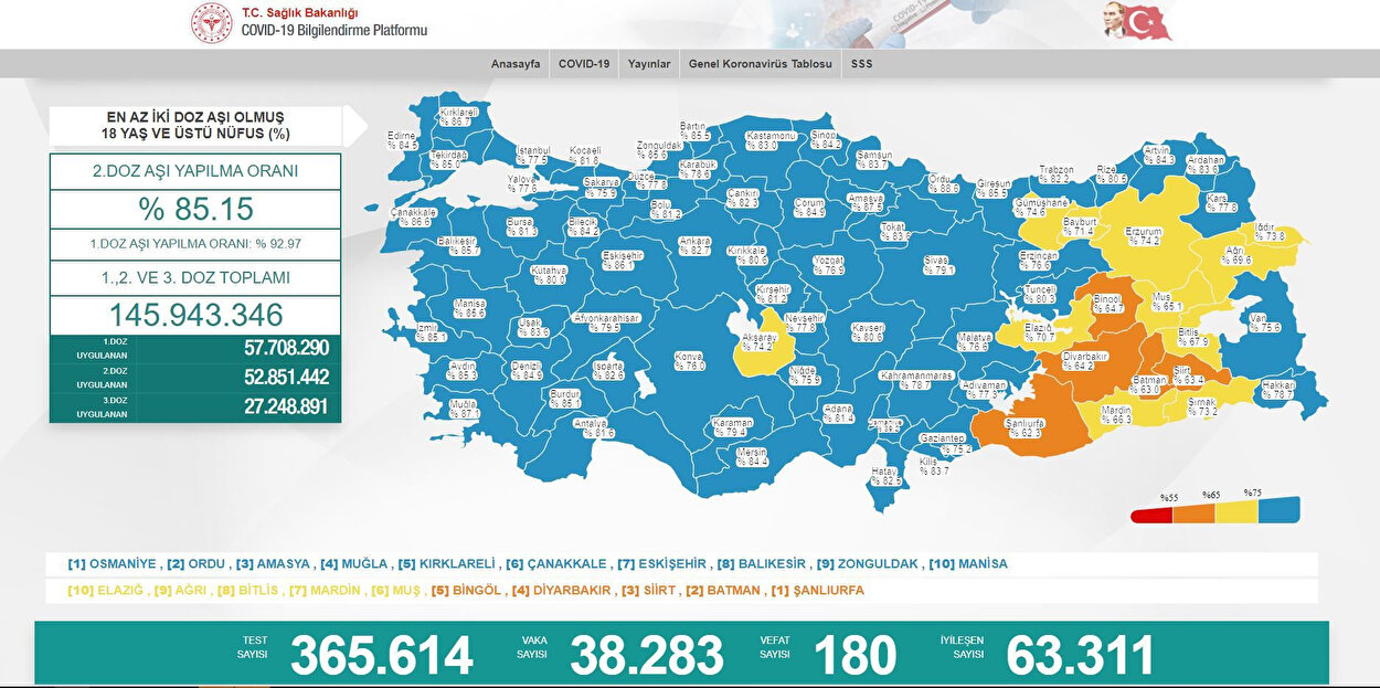 En az 2 doz aşı olan kişi sayısının en yüksek olduğu iller; Osmaniye, Ordu, Amasya, Muğla, Kırklareli, Çanakkale, Eskişehir, Balıkesir, Zonguldak ve Manisa olurken, 2 doz aşı yapılan kişi sayısının en düşük olduğu iller ise Şanlıurfa, Batman, Siirt, Diyarbakır, Bingöl, Muş, Mardin, Bitlis, Ağrı ve Elazığ oldu.