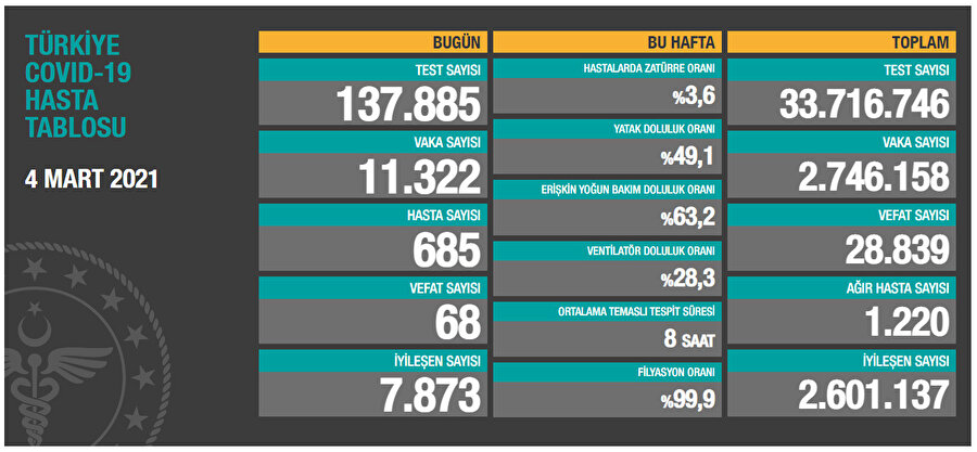 Sağlık Bakanlığı'nın sitesindeki Koronavirüs Bilgilendirme Sayfası'nda 4 Mart koronavirüs tablosu yayınlandı. İşte 4 Mart koronavirüs vaka ve ölü sayıları...