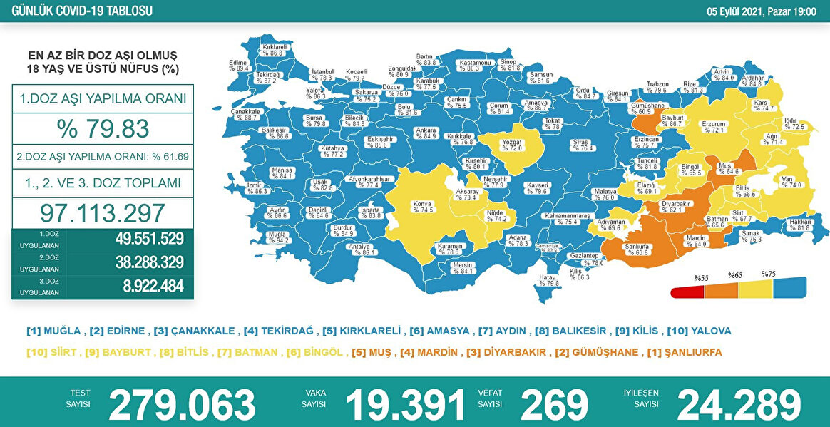 En yüksek aşılama oranına sahip iller; Muğla, Edirne, Çanakkale, Tekirdağ, Kırklareli, Amasya, Aydın, Balıkesir, Kilis ve Yalova olurken en düşük aşılama oranına sahip iller ise Siirt, Bayburt, Bitlis, Batman, Bingöl, Muş, Mardin, Diyarbakır, Gümüşhane ve Şanlıurfa oldu.