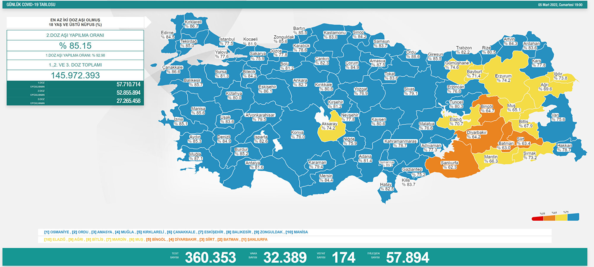 Bakanlığın tablosuna göre yüzde 62,3 ile Türkiye’de en az aşılamanın gerçekleştirildiği Şanlıurfa’yı sırasıyla Batman, Siirt, Diyarbakır, Bingöl, Muş, Mardin, Bitlis, Ağrı ve Elazığ takip etti.