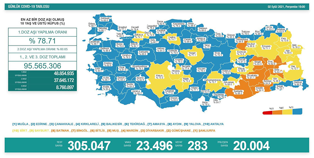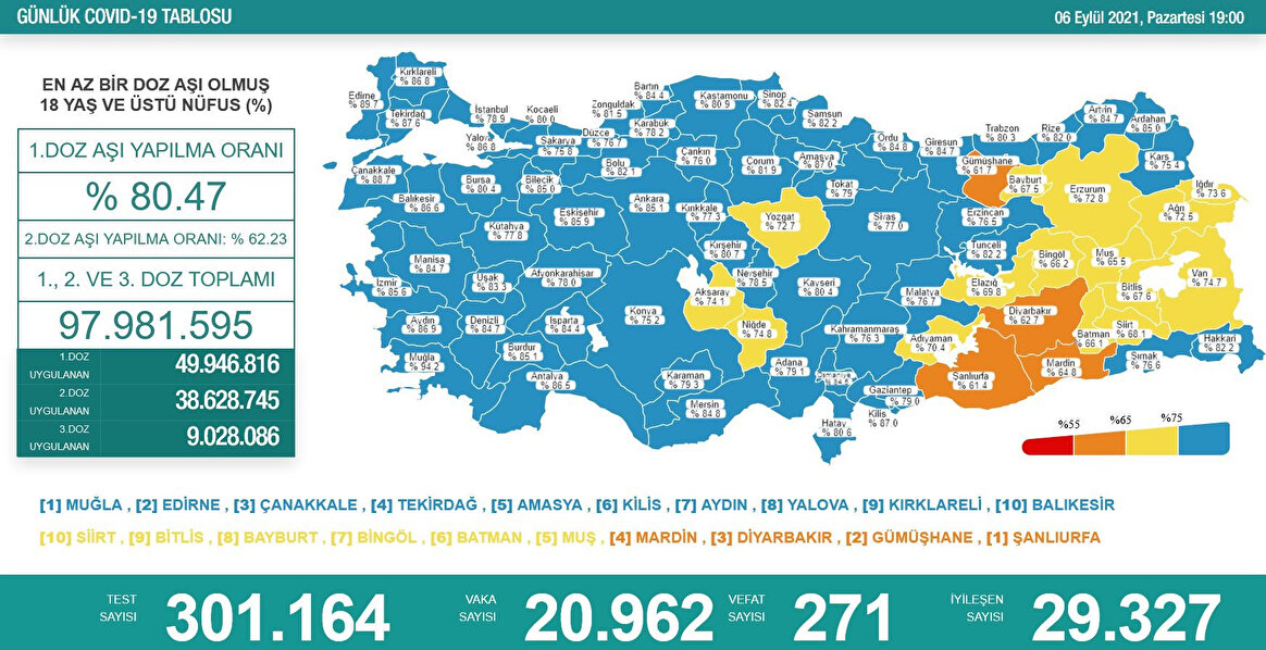 En yüksek aşılama oranına sahip iller; Muğla, Edirne, Çanakkale, Tekirdağ, Amasya, Kilis, Aydın, Yalova, Kırklareli ve Balıkesir olurken en düşük aşılama oranına sahip iller ise Siirt, Bitlis, Bayburt, Bingöl, Batman, Muş, Mardin, Diyarbakır, Gümüşhane ve Şanlıurfa oldu.