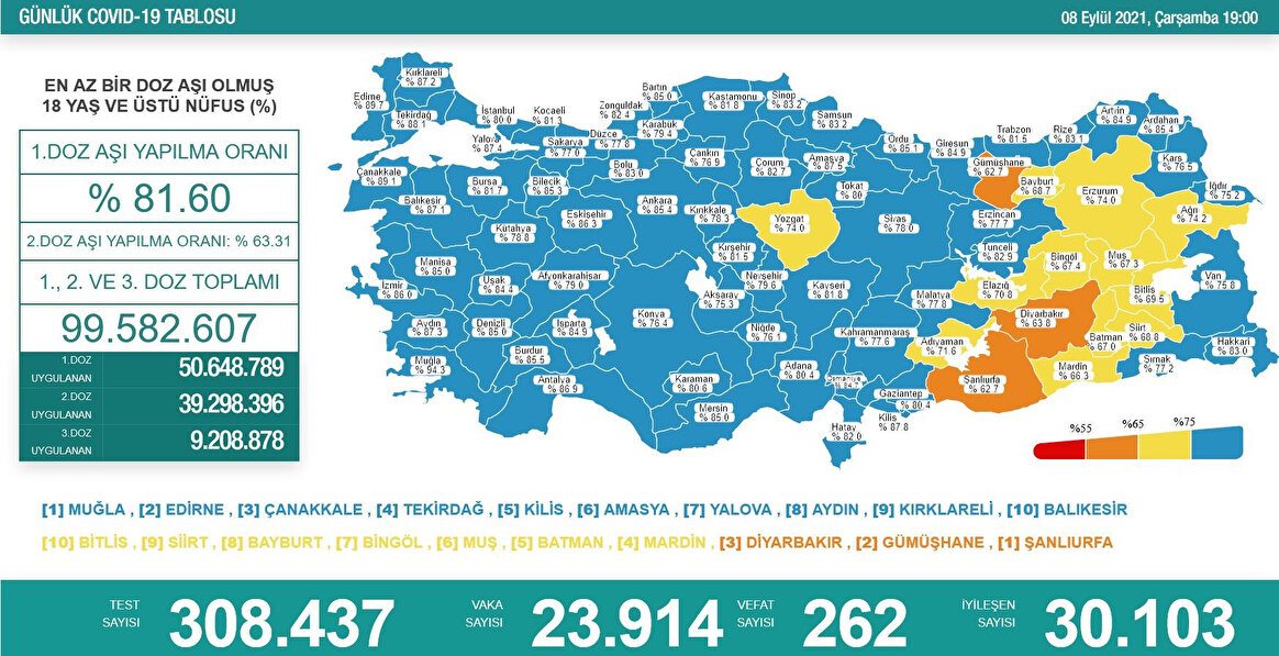 En yüksek aşılama oranına sahip iller; Muğla, Edirne, Çanakkale, Tekirdağ, Kilis, Amasya, Kırklareli, Aydın, Yalova ve Balıkesir olurken, en düşük aşılama oranına sahip iller ise Bitlis, Siirt, Bayburt, Bingöl, Batman, Muş, Mardin, Diyarbakır, Gümüşhane ve Şanlıurfa oldu.