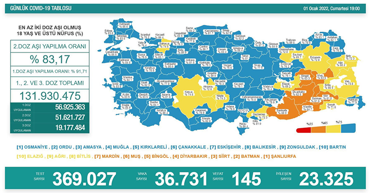 18 yaş ve üstü nüfusta en az iki doz aşı yaptıranların oranının en yüksek olduğu 10 il Osmaniye, Ordu, Amasya, Muğla, Kırklareli, Çanakkale, Eskişehir, Balıkesir, Zonguldak ve Bartın oldu.