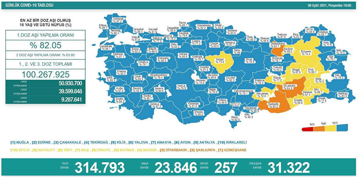 En yüksek aşılama oranına sahip iller; Muğla, Edirne, Çanakkale, Tekirdağ, Kilis, Amasya, Kırklareli, Aydın, Yalova ve Balıkesir olurken, en düşük aşılama oranına sahip iller ise Bitlis, Siirt, Bayburt, Bingöl, Batman, Muş, Mardin, Diyarbakır, Gümüşhane ve Şanlıurfa oldu.