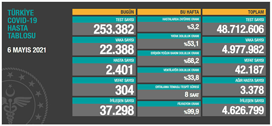 Haftalık verilere göre, bu hafta hastalarda zatürre oranı yüzde 3,2, yatak doluluk oranı yüzde 53,1, erişkin yoğun bakım doluluk oranı yüzde 68,2 ventilatör doluluk oranı yüzde 33,8, ortalama temaslı tespit süresi 8 saat, filyasyon oranı yüzde 99,9 olarak kayda geçti.