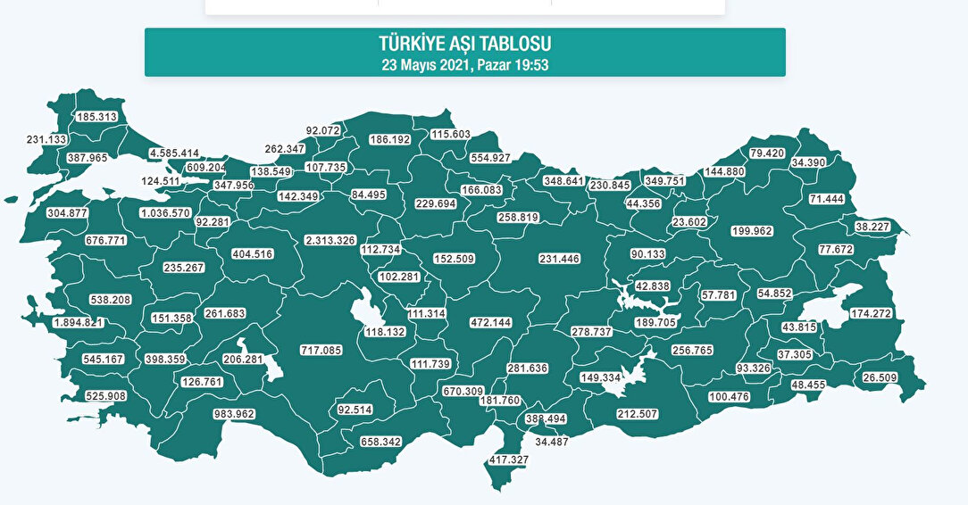 Haritaya göre, İstanbul'dan 4 milyon 585 bin 414, Ankara'da 2 milyon 313 bin 326 ve İzmir'de ise 1 milyon 894 bin 821 doz koronavirüs aşısı uygulandı.