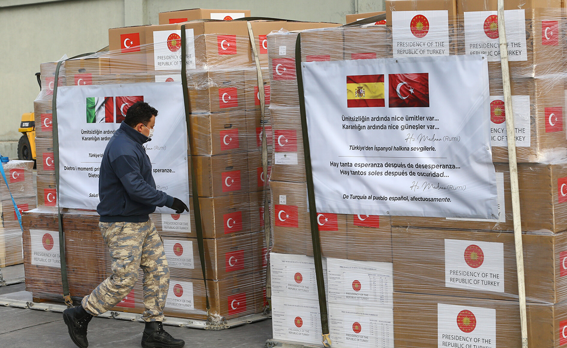 Türkiye, Milli Savunma Bakanlığı (MSB) bünyesindeki askeri fabrikalarda, dikimevleri ile Makina ve Kimya Endüstrisi Kurumunda, yerli ve milli imkanlarla üretilen tıbbi yardım malzemesini salgından en çok etkilenen İspanya ve İtalya’ya askeri uçakla göndermişti.