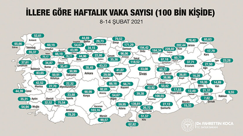 Bakanlığın “covid19.saglik.gov.tr” adresinde Türkiye haritası üzerinden yayımlanan verilere göre, her 100 bin kişide bazı illere göre haftalık (8-14 Şubat) Kovid-19 vaka sayısı şöyle: “Adana (59,95), Adıyaman (100,55), Ankara (35,49), Antalya (78,20), Artvin (78,42), Aydın (35,21), Balıkesir (83,65), (12,49), Bolu (44,96), Bursa (34,87), Çanakkale (37,61), Diyarbakır (17,53), Düzce (43,99), Edirne (65,66), Erzurum (37,71), Eskişehir (30,99), Gaziantep (26,72), Giresun (184,34), İstanbul (60,19), İzmir (44,39), Kahramanmaraş (39,38), Karaman (103,16), Kars (17,79), Kayseri (56,71), Kocaeli (88,19), Konya (90,99), Mardin (15,33), Mersin (90,57), Nevşehir (66,16), Ordu (194,42), Osmaniye (139,81), Rize (202,44), Sakarya (76,77), Samsun (171,29), Siirt (21,37), Sivas (33,08), Şanlıurfa (27,12), Şırnak (7,82), Trabzon (228,02), Zonguldak (54,67).”
