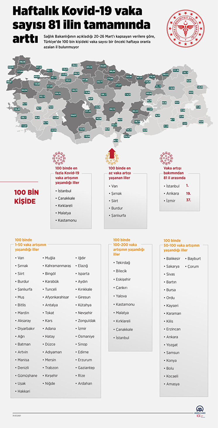 Sağlık Bakanlığının açıkladığı 20-26 Mart'ı kapsayan verilere göre, Türkiye'de 100 bin kişideki vaka sayısı bir önceki haftaya oranla azalan il bulunmuyor. İstanbul, Çanakkale, Kırklareli, Malatya ve Kastamonu 100 binde en fazla vaka artışının yaşandığı iller olarak sıralandı. En az vaka artışı Van, Şırnak, Siirt, Burdur ve Şanlıurfa'da yaşandı. Türkiye genelinde bir haftada 100 bin nüfusta Kovid-19 vaka artışı 10 ilde 100-200, 19 ilde 50-100, 52 ilde ise 1-50 aralığında görüldü.