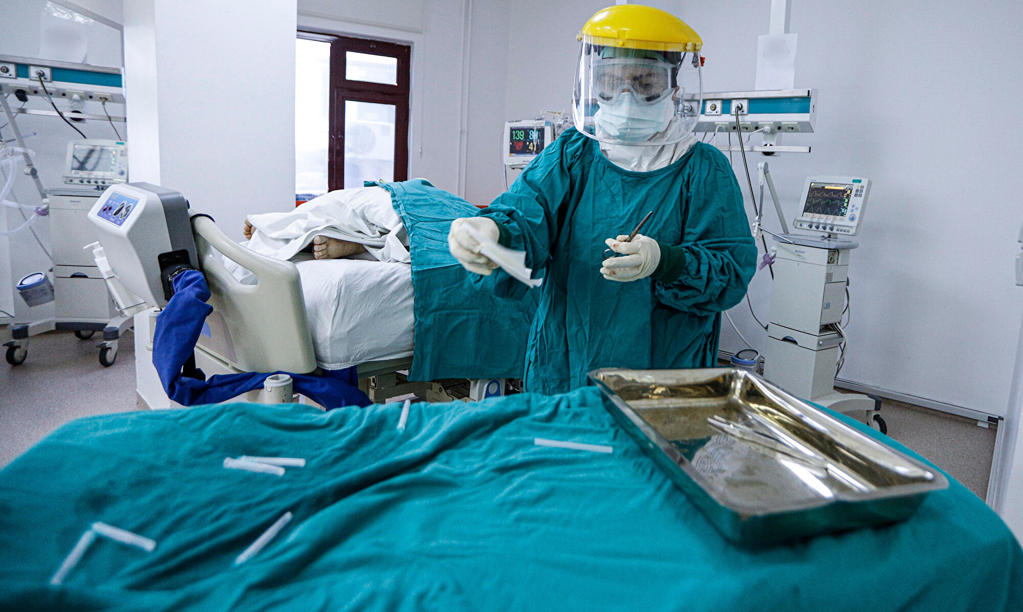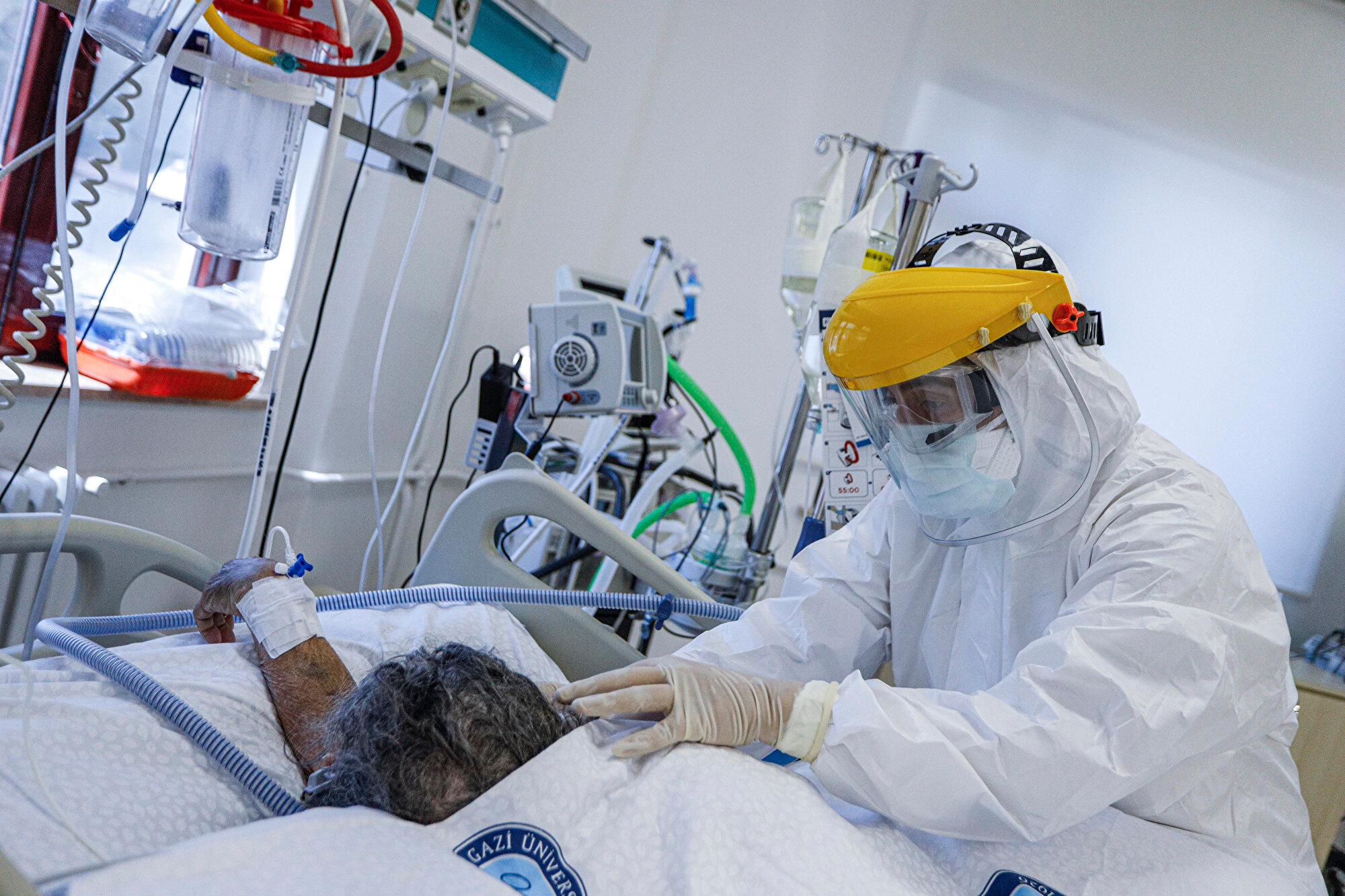 Gazi Üniversitesi Hastanesi'nde 3 yataklı servis, 3 yoğun bakım ünitesinde yüzde 100 doluluk oranıyla Kovid-19'a karşı büyük mücadele veriliyor. Kendilerine bulaş riskini azaltabilmek için koruyucu önlemleri çok sıkı uygulayan sağlık çalışanları, yoğun bakımda bunaltan sıcağa rağmen tulumların içinde maske, gözlük ve siperliklerini takıp özveriyle çalışıyor.