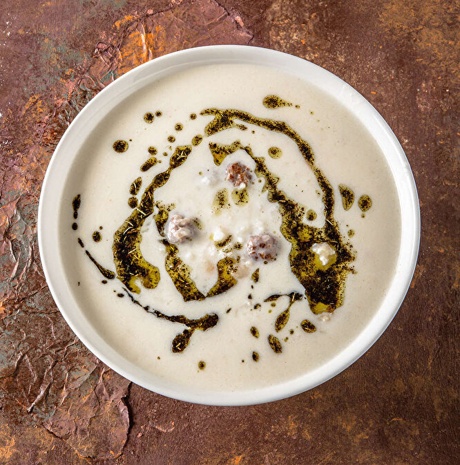 Kıymaya tuz ve karabiber serpip yoğurun. Bir tepsiye unu serpin ve kıymadan nohut büyüklüğünde yuvarlayıp una bulanmasını sağlayın. Bir tavayı kızdırıp yağlayın, köfteleri kızartın ve kenara alın. Buğdayı geceden kalan suyuyla ayrı bir yerde haşlayın. Nohutların da suyunu döküp ayrı bir yerde haşlayın. Buğday ve nohudu suyuyla beraber aynı tencereye alıp kemik suyunu ilave edin ve 10 dakika kaynatın. Köfteleri ve tuzunu ilave edin. Ayrı bir yerde yoğurt ve yumurtayı pürüzsüz olana kadar çırpın. Kaynayan çorbadan bir kepçe alıp yumurtalı yoğurda bağlayın ve hızlı hızlı karıştırın. Yoğurdun tamamını çorbaya ilave edip karıştırarak bir taşım kaynattıktan sonra altını kapatın. Ayrı bir yerde tereyağını kızdırın ve naneyi ilave edip altını kapatın. Çorbayı servis ederken üzerinde gezdirin.