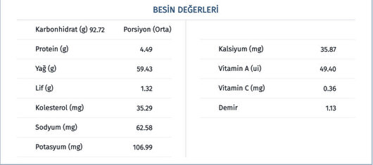 , 59,43 yağ(g), 1,32 lif(g), 62,58 Sodyum(mg), 106,99