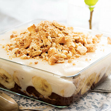 Servis için bir borcamın dibine bisküvileri dizin ve kenarlara dilimlenmiş muzları dizin. Çikolatalı muhallebiyi dökün ve yayın. Üzerine bir kat daha bisküvi döşeyin ve muz dilimleri yayın. Üzerine sade muhallebiyi dökün ve yayın. Buzdolabında soğuttuktan sonra ekstradan bisküvi kırıntıları ile servis edin.
