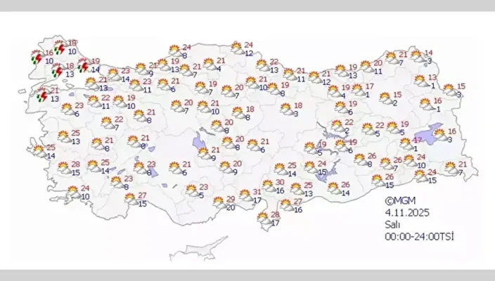 Meteoroloji Genel Müdürlüğü, 2 Kasım Pazar gününe ilişkin hava durumu raporunu yayımladı. Rapora göre; hava sıcaklıklarının yurt genelinde mevsim normallerinin üzerinde seyredeceği tahmin ediliyor. Yurdun batı kesimlerinin parçalı bulutlu, diğer yerlerin az bulutlu ve açık geçeceği tahmin ediliyor. Genellikle kuzeyli yönlerden, hafif ara sıra orta kuvvette esmesi bekleniyor. İşte 2 Kasım 2025 il il hava durumu tahminleri.