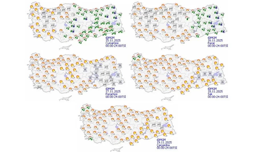 Meteoroloji Genel Müdürlüğü’nden alınan tahminlere göre, hava sıcaklığı iç ve doğu kesimlerde 2 ila 4 derece azalacak, diğer yerlerde önemli bir değişiklik olmayacak. Rüzgar ise genellikle kuzeyli, doğu kesimlerde güneyli yönlerden hafif, ara sıra orta kuvvette, Güneydoğu Anadolu’nun doğusu ile Doğu Anadolu’da kuvvetli (40-60 km/sa) esecek. Bazı illerde beklenen hava durumuyla günün en yüksek sıcaklıkları ise şöyle: