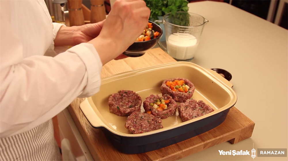 ·Yoğurduğunuz köfte hamurunu elinizle çanak şeklini verin ve fırın kabına yerleştirin