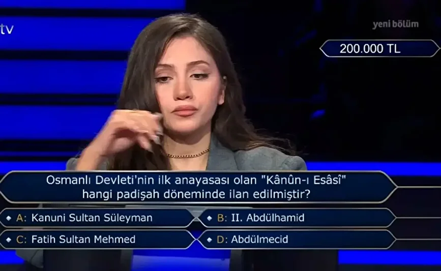 Kim Milyoner Olmak İster'de bu akşam ekranlara gelen yeni bölümde bir soru kafaları karıştırdı. İzleyicilerin de merak ettiği "Osmanlı Devleti'nin ilk anayasası olan Kânûn-ı Esâsî hangi padişah döneminde ilan edilmiştir?" sorusunun yanıtı açıklandı. İşte 20 Kasım 2025 tarihli 200 bin TL değerindeki sorunun doğru yanıtı.
