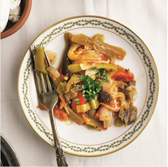 - Toz biberi serpin, kokusu çıkınca domatesleri ekleyin. Domatesler suyunu verince patlıcanları ekleyin, tuzunu serpin ve yemeğin altını kısın. Kendi suyunda yavaş yavaş pişirin. Bütün sebzeler yumuşadıgında ılık olarak servis edin.