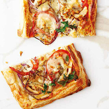 Milföy hamurunuzu iki adet dikdörtgen olacak şekilde kesin. Pişirme kağıdı serdiğiniz fırın tepsisine yerleştirin. Kenarlarından 2 mm kadar kesin ve kenarlarına kontür olacak şekilde yerleştirin. Orta boşluğa tavuk etlerini yayın ve tuz serpin. Üzerine domates ve soğanları dizin. Hamurun kenarlarına yumurta sarısı sürün ve önceden ısıtılmış 200 derecelik fırında kenarları kızarana kadar pişirin. Pişirdikten sonra peyniri ve maydanozları serpin. Eriyene kadar biraz daha fırınlayın. Sıcakken kekik ve karabiber serpin.