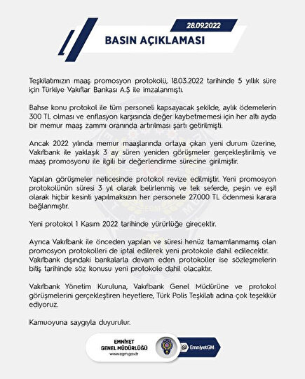 Emniyet Genel Müdürlüğü yaptığı açıklamada polislere 36 ay için 27 bin lira promosyon ödemesinin karara bağlandığını duyurdu. Promosyon peşin ve tek seferde 1 Kasım 2022 tarihi itibarıyla ödenecek.