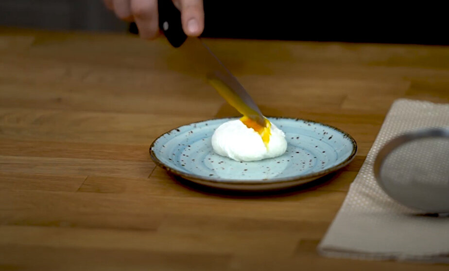 Suyu sos tenceresine koyun, kapağını kapatın. Su iyice ısınsın ama kaynamasın. Sirkeyi ekleyin, yumurtanın dağılmayıp bir arada kalmasını kolaylaştıracak. Bir kevgir yardımıyla dairesel hareketlerle karıştırın yumurtayı nazikçe ortasına bırakın. 2-3 dakika yumurtanın beyazı sertleşinceye kadar bekletin. Yumurtayı bir kevgirle tencereden alıp suyunu iyice süzün. Tuz ve toz karabiber ile tatlandırın.