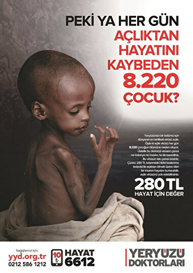 Dünyada herkese yetecek kadar gıda üretimi olmasına rağmen 821 milyon insan, her gece aç yatıyor. Açlık yüzünden her gün 8 bin 220 çocuk hayatını kaybediyor. Afganistan’da 12 milyon üzerinde kişi güvenli gıdaya ulaşamıyor, Yemen’de 10 milyon kişi kıtlığın eşiğinde, Çad’da ise 5 yaş altı çocukların yüzde 43 beslenme yetersizliği nedeniyle gelişimini tamamlayamıyor. Buna karşı, dünyanın bir bölümü için en tehlikeli virüsünün hala ‘açlık’ olduğunu hatırlatan Yeryüzü Doktorları, ‘Peki, Ya Her Gün Açlıktan Hayatını Kaybeden 8220 Çocuk?’ sloganıyla yeni bir kampanya başlattı.