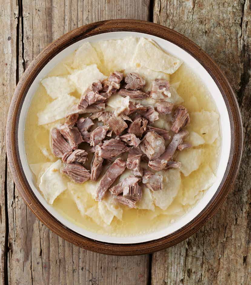 Kemikli kuzu etini ve zeytinyağını tencereye alıp 2 dakika soteleyin ve üzerini örtecek kadar sıcak su ilave edip pişmeye bırakın. Köpükleri yüzeye cıkınca kevgir yardımıyla alın. Etler kemiklerinden iyice ayrılıncaya kadar pişirin. Tuzunu ayarlayın. Servis tabaklarına lavaş ekmeklerini didikleyin ve üzerlerine et suyu gezdirin. Etleri de üzerlerine didikleyip servis edin.
