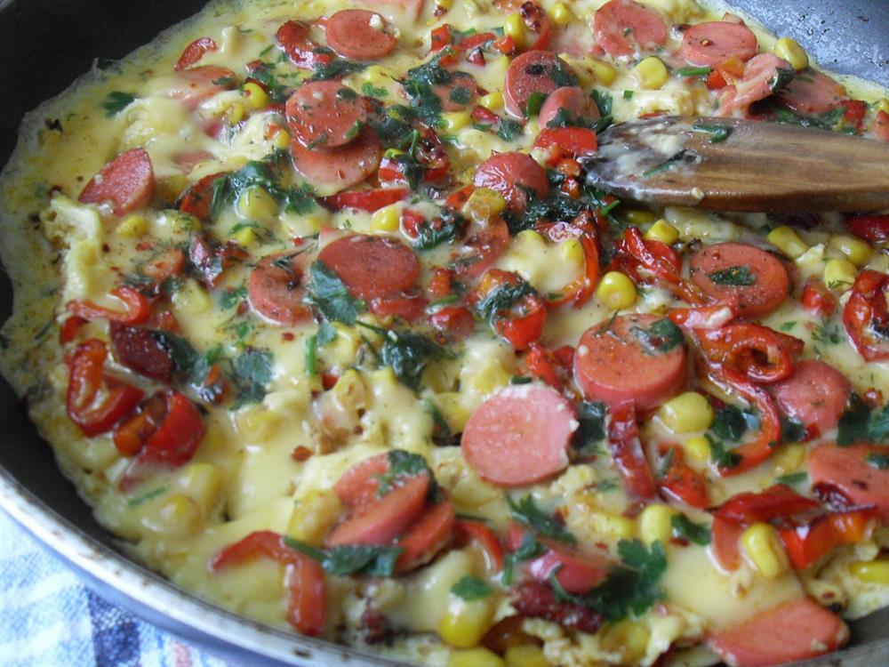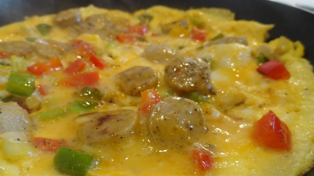 Patatesleri ince ince doğrayın ve sucukları kızartın. Küçük boy bir tavada tereyağını eritin ve ardından sucukları ilave edin. İki yüzünü de ayrı ayrı kızarttığınız sucukları kısık ateşte beklemeye bırakın. Bir başka yerde yumurtaları çırpın ve içine tuz ve karabiber ilave edin.Yumurta karışımını kısık ateşte bekleyen sucukların üzerine ilave edin. Yumurtayı pişmeye bırakın ve son olarak rende kaşarları ekleyin; yumurta tavanızın kapağını kapatın ve kaşarlar eriyinceye kadar yaklaşık 5 dakika pişirin.