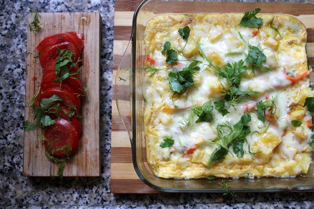 Hazırladığımız bütün karışımı önceden tereyağı gezdirdiğiniz fırın kapına dökün ve üzerlerine önceden halka şeklinde dilimlediğiniz domatesleri ekleyin. Önceden ısıttığınız 180 derece fırında yaklaşık yarım saat pişirin. Yumurtaları oda sıcaklığında kullanırsanız, omletiniz daha çok kabaracaktır. Dilerseniz üzerine ekstra peynir de eritip ilave edebilirsiniz. Dilerseniz tek tek porsiyon halinde ya da tepside pişirebilirsiniz.