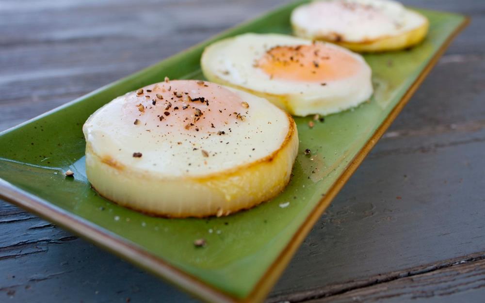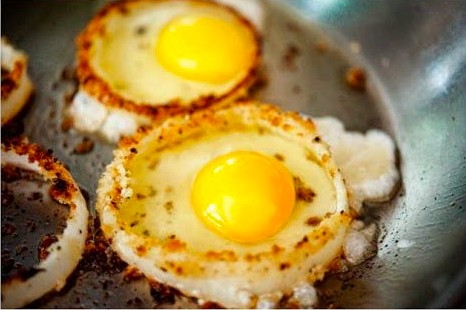 Soğan sevenler buraya gelsin; bu tarif sizin için. Öncelikle halka halka ve kalın doğranması gereken soğanları hazırlayın. Farklı bir kapta tuz, karabiber ve galeta ununu karıştırın. Soğanları bu karışıma bulayın ve küçük bir tavada zeytinyağını kızdırın. Galeta ununa bulanan soğanları kızgın yağa atın ve kızartın. Soğan kokusu çıkmaya başladığında yumurtaları soğan dilimlerinin ortalarına kırın ve tavanın üzerini bir kapak yardımı ile kapatın. Soğan ve yumurtalar pişerken tavanın kapağını kapatmak hem yumurtaların daha hızlı pişmesini hem soğanların biraz daha sulu kalmasını sağlar.