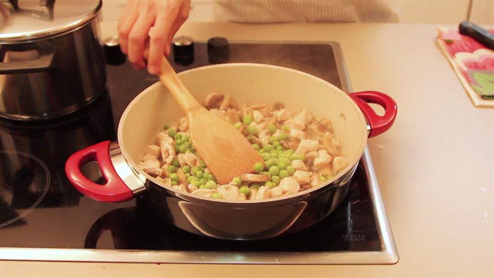 Suyunu çekmeye yakın bezelyeleri ilave edin. Tuz ve karabiberi serpin.