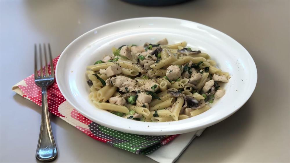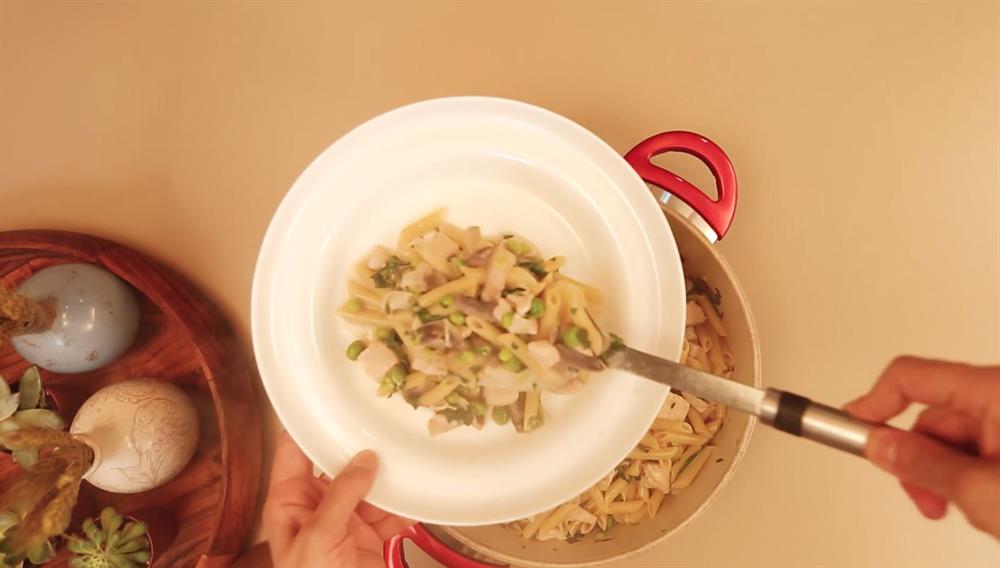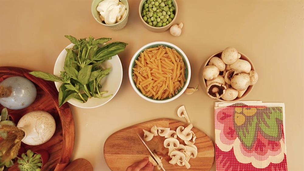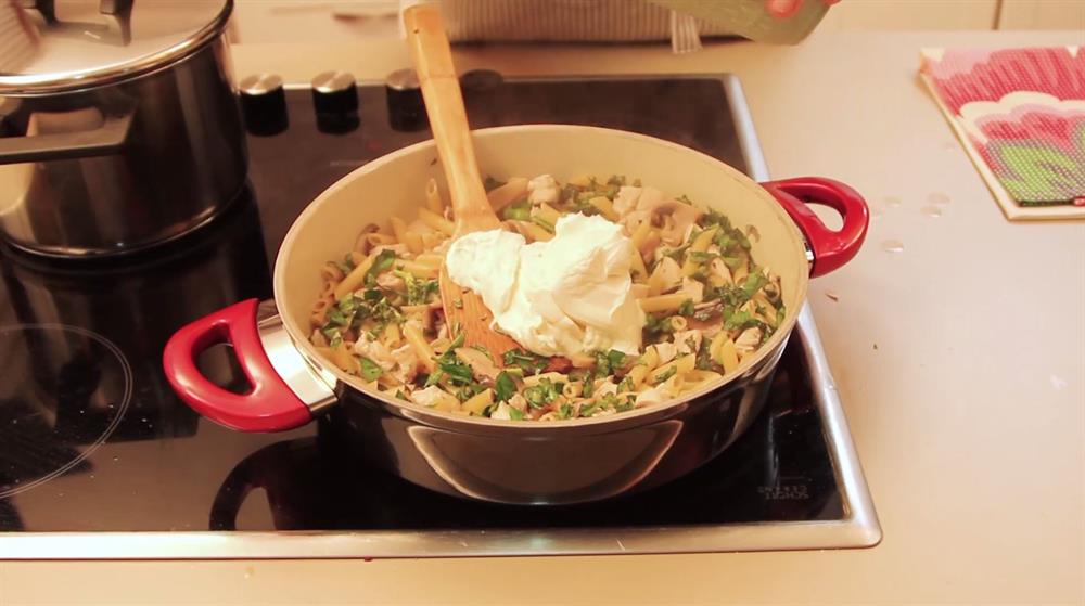 Ayrı bir yerde fesleğeni kıyın. Sebzelerin hepsi yumuşayıp makarnalar suyunu çekince kremayı ekleyin ve çektirin. Fesleğeni ekleyip karıştırın.