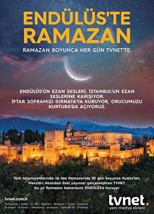 Türk televizyonlarında ilk kez Ramazan’da 30 gün boyunca Kudüs’ten özel yayınlar yapan TVNET, bu yıl Ramazan kamerasını Endülüs’e kurdu. Endülüs sokaklarında okunan ezan sesleri, İstanbul'un ezan seslerine karışırken iftar sofraları Gırnata'da kurulup Kurtuba'da açılacak. “Endülüs'te Ramazan”, Ramazan boyunca her gün TVNET ekranlarında.