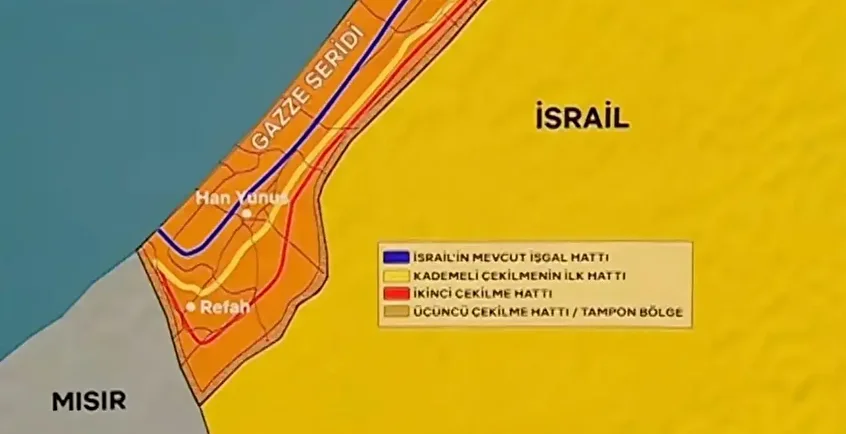 По условиям первого этапа плана, разработанного при посредничестве Трампа, боевые действия прекращаются после официального одобрения израильским правительством. Израильские силы обязуются прекратить авиаудары и артиллерийский обстрел, однако сохраняют контроль над Хан-Юнисом, Рафахом и рядом районов к востоку от Газы. В течение 72 часов ХАМАС должен освободить всех израильских заложников, включая погибших, а Израиль, в свою очередь, освободит около 2 000 палестинских заключённых, среди которых 250 человек, осуждённых на пожизненные сроки.