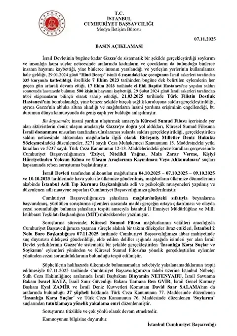 ГЕНЕРАЛЬНАЯ ПРОКУРАТУРА ГОРОДА СТАМБУЛ Пресс-служба 07.11.2025 ПРЕСС-РЕЛИЗ Государство Израиль до сегодняшнего дня систематически совершает в секторе Газа преступления геноцида и преступления против человечности, в результате которых погибли тысячи мирных жителей, включая женщин и детей, тысячи были ранены, а жилые районы разрушены и стали непригодными для проживания. 29 января 2024 года шестилетняя девочка по имени Хинд Реджеп была убита израильскими солдатами 335 выстрелами. Указанные преступления, начавшиеся 7 октября 2023 года, продолжаются до настоящего времени. 17 октября 2023 года в результате нападения на больницу Аль-Эхли Баптист погибло 500 человек. 29 февраля 2024 года израильские солдаты преднамеренно уничтожили медицинское оборудование. 21 марта 2025 года была атакована больница турецко-палестинской дружбы, а также множество других медицинских учреждений. Сектор Газа находится под блокадой, что препятствует доступу гуманитарной помощи пострадавшим. В этом контексте активисты, направлявшиеся в Газу в составе Глобальной флотилии «Сумуд», подверглись нападению израильских военно-морских сил в международных водах. В результате нападения были задержаны гражданские лица, после чего Генеральная прокуратура Стамбула начала расследование на основании положений Конвенции ООН по морскому праву, статьи 15 Уголовно-процессуального кодекса №5271, а также статей 12 и 13 Уголовного кодекса №5237, предусматривающих юрисдикцию Турции в подобных случаях. Жертвы, задержанные израильскими властями, были возвращены в Турцию с 4 по 10 октября 2025 года воздушным транспортом. После прибытия в страну они прошли судебно-медицинское и психологическое обследование в Институте судебной медицины Стамбула, заключения которого были переданы в прокуратуру. В ходе расследования прокуратура взяла показания пострадавших и заявителей, а также направила официальные запросы в Департамент полиции Стамбула и Национальную разведывательную организацию (MİT) для установления фактов и лиц, причастных к преступлениям. Юридические представители участников «Глобальной флотилии Сумуд» обратились в прокуратуру Стамбула с заявлением от 7 ноября 2025 года, содержащим жалобу на израильских государственных должностных лиц. В ходе проверки установлено, что указанные лица несут уголовную ответственность за систематические преступления против человечности и геноцид, совершённые в секторе Газа, а также за нападение на гуманитарную флотилию. Поскольку подозреваемые не находятся на территории Турции, 7 ноября 2025 года по запросу прокуратуры дежурный мировой уголовный суд Стамбула выдал ордера на арест следующих лиц: Премьер-министр Израиля Биньямин Нетаньяху, Министр обороны Исраэль Кац, Министр национальной безопасности Итамар Бен-Гвир, Начальник Генерального штаба Эяль Замир, Командующий ВМС Давид Саар Салама, и других израильских чиновников, по статьям 77 (преступления против человечности) и 76 (геноцид) Уголовного кодекса Турции. Расследование продолжается с особой тщательностью и всесторонним подходом. Настоящее заявление опубликовано для информирования общественности. Генеральная прокуратура города Стамбул Пресс-служба