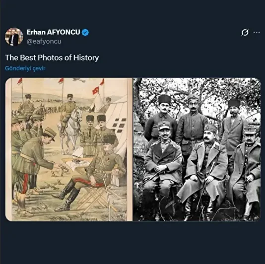 В ответ на публикацию турецкий историк профессор Эрхан Афьенджу поделился в соцсетях архивным снимком капитуляции греческих генералов перед Мустафой Кемалем Пашой, сопроводив его комментарием о «лучшей фотографии истории».