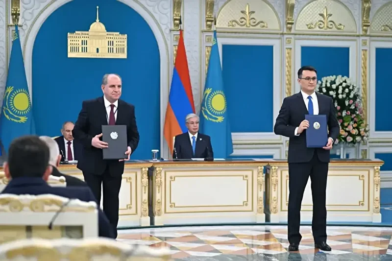 В присутствии лидеров двух стран делегации обменялись крупным пакетом межправительственных и межведомственных документов. Подписанный пакет документов охватывает ключевые сферы казахстанско-армянского сотрудничества и включает соглашения о защите секретной информации, взаимном предоставлении земель для дипломатических миссий, дорожную карту торгово-экономического взаимодействия на 2026–2030 годы, меморандумы по промышленности, цифровизации, искусственному интеллекту и сельскому хозяйству, планы действий МИД и министерств здравоохранения на 2026–2027 годы, соглашение о создании Казахстанско-Армянского делового совета, а также договорённости между национальными библиотеками, кино- и культурными центрами, научными и образовательными учреждениями, включая сотрудничество в области высшего образования и мирного использования атомной энергии; весь пакет, по оценке сторон, формирует прочную основу для дальнейшего углубления двустороннего стратегического партнёрства.