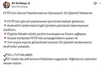 В 32 провинциях Турции жандармерия провела операции против так называемой «текущей структуры» террористической организации FETÖ. В результате задержаны 92 человека, из которых 59 были заключены под стражу, а 8 отпущены под судебный контроль. Следственные действия в отношении остальных продолжаются.
