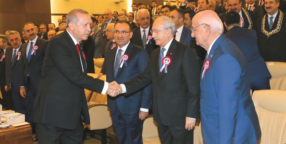 Törene, Cumhurbaşkanı Recep Tayyip Erdoğan, TBMM Başkanı İsmail Kahraman, CHP Genel Başkanı Kemal Kılıçdaroğlu, Genelkurmay Başkanı Orgeneral Hulusi Akar’ın yanısıra Yargıtay Başkanı İsmail Rüştü Cirit, Danıştay Başkanı Zerrin Güngör, eski TBMM Başkanları Bülent Arınç ve Cemil Çiçek, Yüksek Seçim Kurulu Başkanı Sadi Güven ve yargı mensupları ile Venedik Komisyonu Başkanı Gianni Buquicchio ve 20 ülkeden Anayasa Mahkemesi Başkan ve üyeleri katıldı. Törene katılan misafirleri Başkan Vekilleri Burhan Üstün ve Engin Yıldırım karşıladı. Cumhurbaşkanı Erdoğan’a gelişi esnasında Başkan Zühtü Arslan eşlik etti. Erdoğan salona girdiği sırada tüm protokol üyeleri ile diğer misafirler ayağa kalktı. Erdoğan, TBMM Başkanı İsmail Kahraman ve CHP Genel Başkanı Kılıçdaoğlu ile protokolda bulunanlarla tek tek tokalaştı. Erdoğan ve Kılıçdaroğlu’nun tokalaşma esnasında birbirlerinin yüzüne bakmaması ise dikkat çekti.