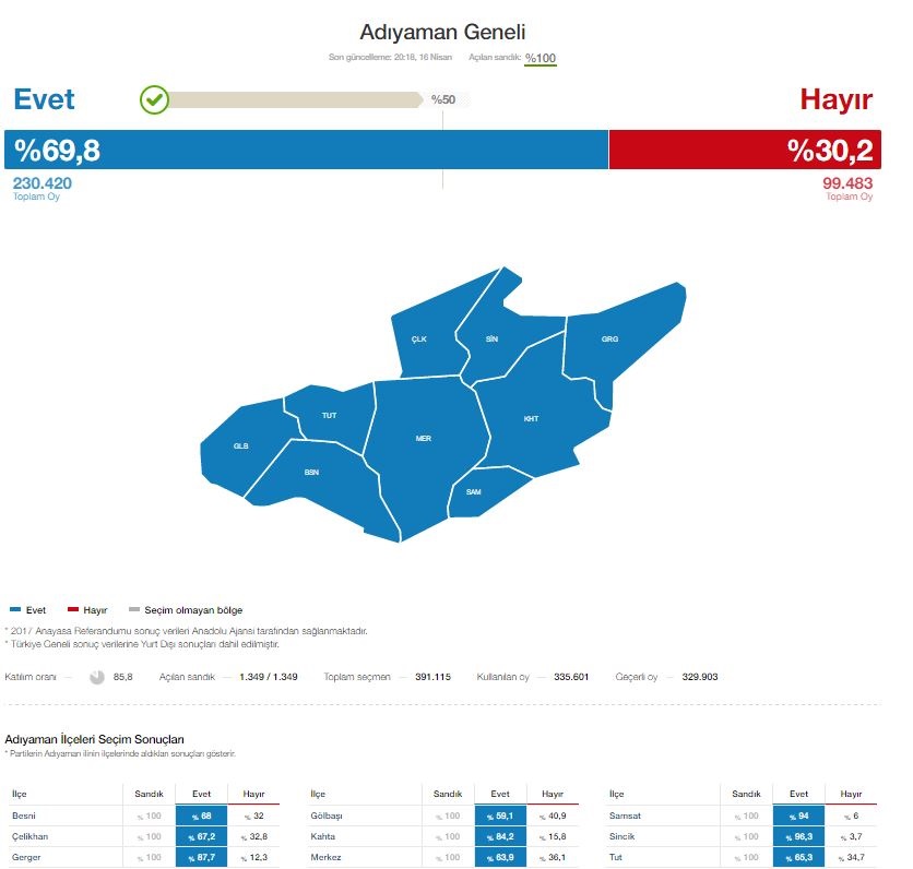 En yüksek 'Evet' oyu veren ilçe, resmi olmayan sonuçlara göre Adıyaman'ın Sincik ilçesi olarak belirlendi. Sincik'in yüzde 96.3'ü evet dedi.