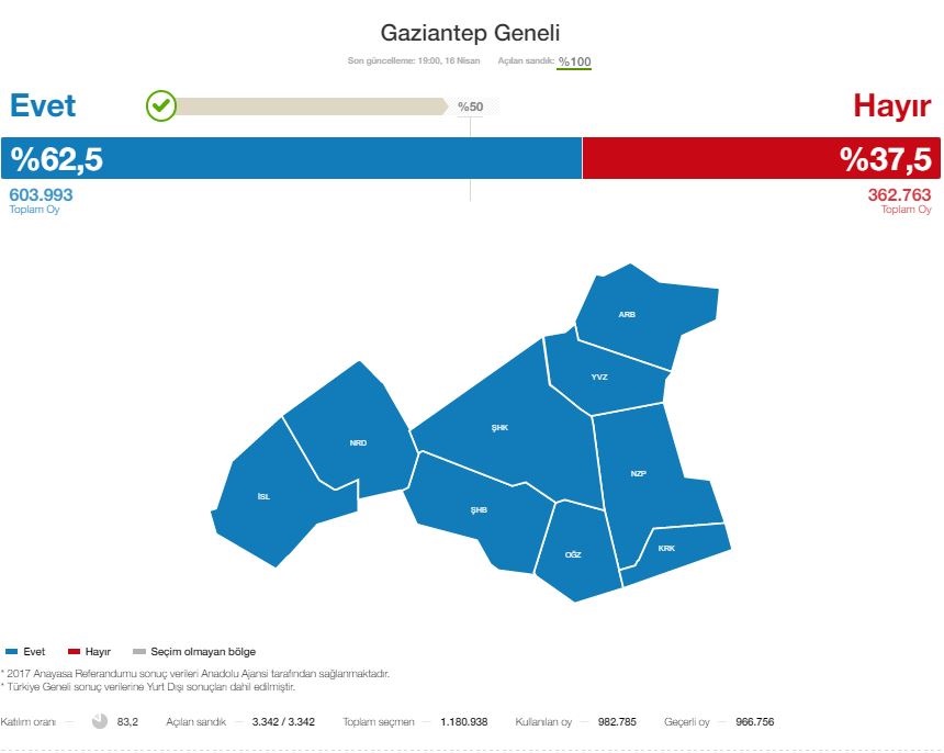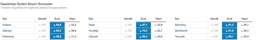 Tüm ilçelerinden evet çıkan Gaziantep'te oy oranları şöyle: