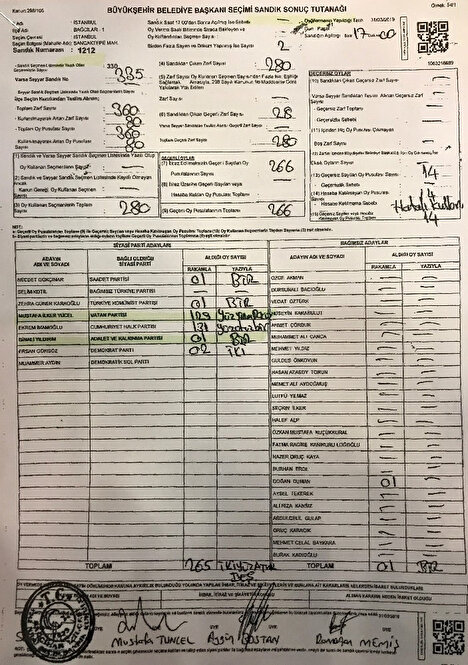 Arnavutköy'deki 1263 numaralı sandıkta da Yıldırım'dan 107 oy çalındı ve sisteme 6 oy kaydedildi.