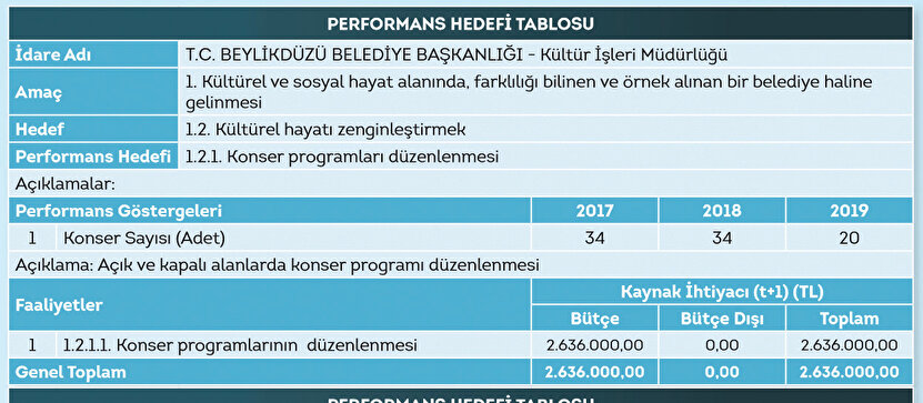 Performans raporunun 72. sayfasında 2019 yılında yapılması planlanan 20 konser bilgisine yer verildi. 20 konser programının düzenlenmesi için bütçeden 2 milyon 636 bin TL’lik ödenek ayrıldı. Yine aynı sayfada belirli gün ve özel hafta etkinlikleri düzenlenmesine ilişkin bilgiye de yer verildi. 2018 yılında 154 adet saygı, anma geceleri ve etkinlikler programı için 1 milyon TL ödenek ayrılırken, 2019 yılı için yapılması planlanan 155 adet saygı, anma geceleri ve etkinlikler programı için 2 milyon 334 bin TL’lik bütçe ayrıldı. Raporun 68. sayfasında kent konseyi çalışmalarının etkin ve verimli bir şekilde yürütülmesi için toplantılar düzenlenmesine ilişkin ayrılan bütçeye yer verildi. 2018 yılında 10 bin TL’lik olan bütçe, 2019 yılında 10 kat arttırılarak 100 bin TL’ye çıkartıldı.