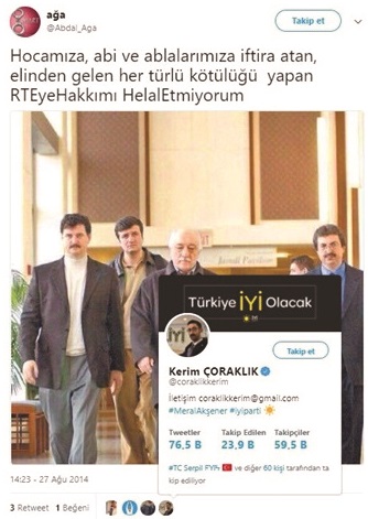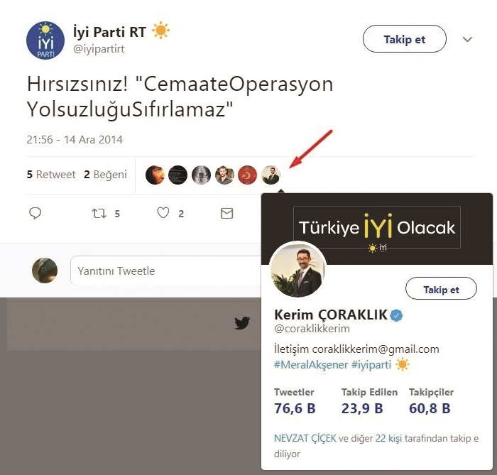İYİ Parti’nin iletişim ekibinin başında FETÖ ile irtibatı nedeniyle tutuklanıp daha sonra adli kontrol şartıyla serbest bırakılan Kerim Çoraklık var. Çoraklık partiye ait sosyal medya hesaplarını kontrol ederken bir yandan da FETÖ'cü hesapları İYİ Parti adına yönlendiriyor.