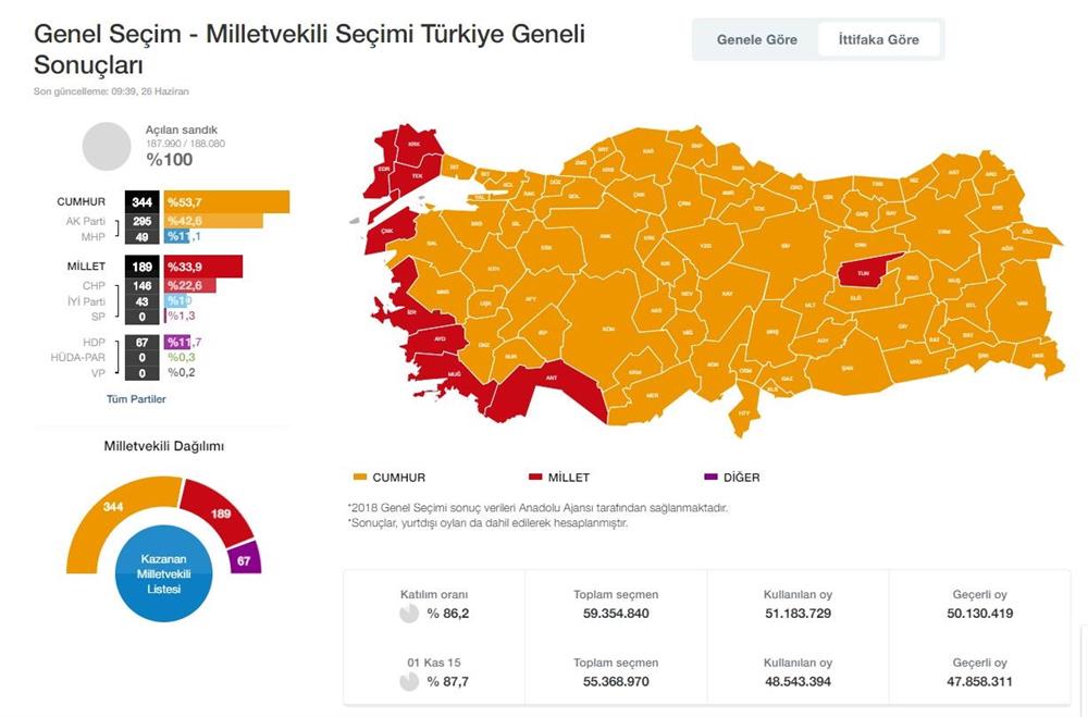 Türkiye 24 Haziran’da sandık başına giderek seçimini yaptı ve yüzde 52,6 ile Recep Tayyip Erdoğan’ı yeni sistemin ilk Cumhurbaşkanı seçti. Aynı zamanda milletvekili seçiminde de yüzde 53,7 ile Cumhur İttifakını 344 sandalye ile Meclis’te çoğunluğa taşıdı. Kesinleşmeyen sonuçlara göre seçimlerde en kritik noktanın İstanbul olduğu ve çıkan sonuçların adeta Türkiye genelini yansıttığı gözlendi. Cumhurbaşkanı Erdoğan’ın da daha önce söylediği gibi “İstanbul’u alan Türkiye’yi kazanır’ vurgusu sonuçların belli olmasıyla birlikte bir kez daha önemini göstermiş oldu. Türkiye genelinde hem cumhurbaşkanlığında hem de milletvekilliğinde Cumhurbaşkanı Erdoğan ile Cumhur İttifakı birinci çıktı. Aynı şekilde çok yakın oranlarla İstanbul’da da Cumhurbaşkanı Erdoğan ve Cumhur İttifakı birinci çıktı. Diğer adaylar ve partilerin sıraları da hem Türkiye genelinde hem de İstanbul genelinde aynı oldu.