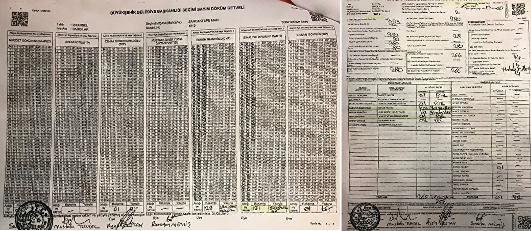 - "Bu sandık kurulunda ilk oy tasnifi, esnasında tüm kurul üyelerinin huzurunda imzalanan 'Sayım Döküm Cetveli'dir. Bu gösterdiğim, tüm işlemler, bittikten sonra hazırlanan ve Yüksek Seçim Kuruluna nüshası gönderilerek YSK sistemine bunun üzerinde giriş yapılan sandık sonuç tutanağıdır. Bu örnekte Bağcılar Sandıktepe Mahallesi, 1212 nolu sandıkta sayım döküm cetvelinde AK Parti'nin aldığı oy 131 iken, maalesef YSK sistemine giren sandık sonuç tutanağında Büyükşehir Belediye Başkanımızın aldığı oy sadece 1 olarak işlenmiştir. Buradaki oylar İmamoğlu'na yazılıyor. Diğer bir tutanağa geçiyorum. 2004 nolu sayım döküm cetveli. Burada da Binali Bey'in aldığı oy, 201. Buradaki döküm cetvelinde olan 201 rakamı, sandık sonuç tutanağında Ekrem İmamoğlu'na yazılıyor. Binali Bey'in oyu kaç? Yine 1."