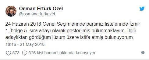 "24 Haziran 2018 genel seçimlerinde partimiz listelerinde İzmir 1. bölge 5. sıra adayı olarak gösterilmiş bulunmaktayım. İlgili adaylıktan gördüğüm lüzum üzere istifa etmiş bulunuyorum"
