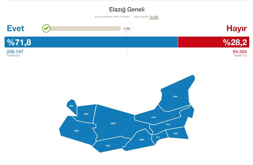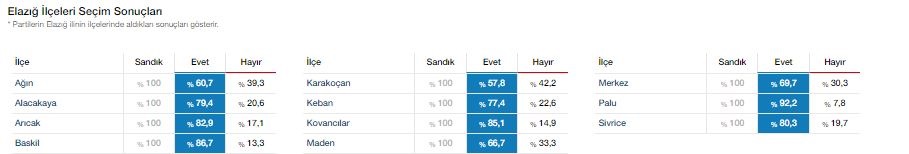 Tüm ilçelerinden evet çıkan Elazığ'da oy oranları şöyle: