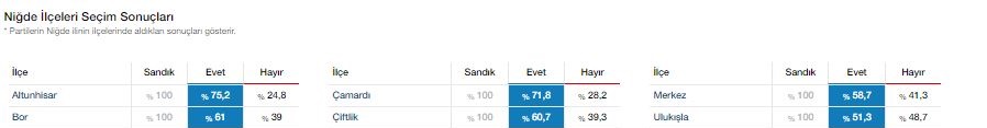 Tüm ilçelerinden evet çıkan Niğde'nin ilçelerinde oy oranları şöyle: